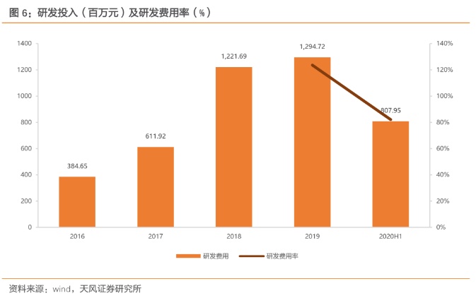 公司持续加大研发投入,多个项目进入关键性临床试验。2016-2019年,公司研发投入持续增加,复合增速接近50%。其中2020年上半年研发投入达到8.08亿元,同比增长20.5%。研发投入增长主要由于临床试验开支进一步增加,其中,IBI-310(CTLA-4单抗)及IBI-306(PCSK9单抗)进入III期试验,IBI-376(PI3Kδ抑制剂)及IBI-375(FGFR抑制剂)进入关键性II期试验。