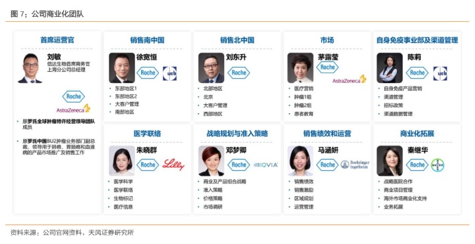 公司已建立一支有竞争力的商业化团队。公司商业化团队目前已经超过1100人,包括销售、医学事务、战略规划和运营工作等多个团队。其中管理团队核心人员主要来自于罗氏,其中首席运营官刘敏曾任罗氏中国BU2肿瘤业务部门副总裁,拥有肿瘤产品市场推广及销售工作的丰富经验。