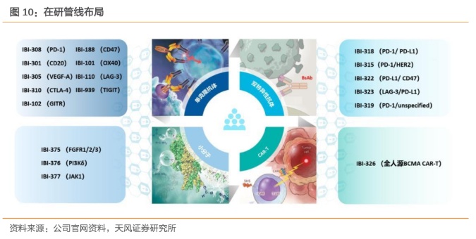 公司管线逐渐从单克隆抗体延伸到新型双特异性抗体,并着手开发小分子药物及细胞免疫治疗CAR-T。公司靶点布局广泛,临床进度领先。信达生物前瞻布局新一代PD-1双抗药物、CD47系列单抗、LAG3系列单抗、TIGIT单抗、OX40系列单抗等新兴肿瘤免疫靶点,其研发及临床进度在国内处于相对领先地位。