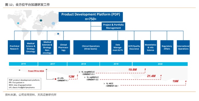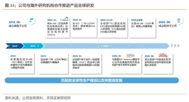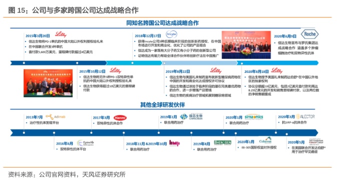 公司建立全球性研发平台,选择具有全球市场潜力的管线产品。公司结合强大的内部研发能力与外部战略合作,建立全球性的研发平台,通过自主或合作进行海外临床开发。公司在海外成立子公司,与MD Anderson癌症中心合作开发信迪利单抗用于多种罕见癌症,并与罗氏达成协议获得双特异性抗体和CAR-T技术平台相关权限。