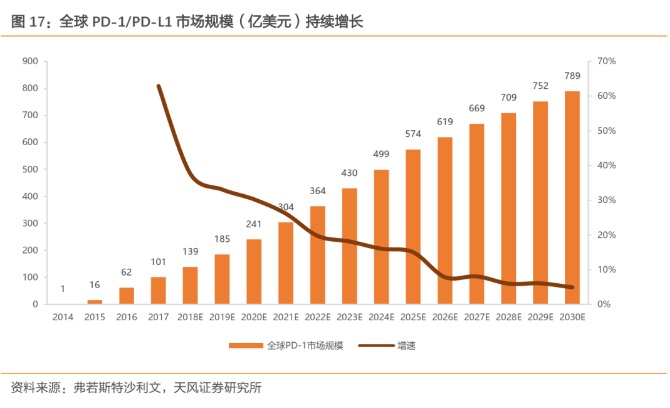PD-1单抗的作用是抑制程序性死亡配体1(PD-L1)与其受体程序性细胞死亡蛋白1(PD-1)的关联,阻止肿瘤细胞的免疫逃逸,因此PD-1对多种类型的癌症治疗都有效果。根据弗若斯特沙利文的估计,到2030年底PD-1药物的全球销售额将达到789亿美元。
