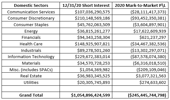 在2020年,按市值计算,做空者损失将近2450亿美元,平均回报率为-26%。其中,空头阵营中损失最大的行业为非必需消费品和IT行业,而能源、房地产、金融和公用事业行业仅能获得微薄收益。