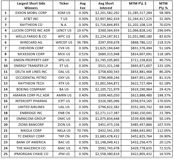 而在亏损方面,2020年空头的实际表现则是非常惨烈。数据显示,空头亏损超10亿美元的股票达到了52只。其中,做空特斯拉(TSLA.US)的空头无疑是2020年损失最惨重的一方,同时这也成为了有史以来最大的空头亏损。而具体做空利润较低的股票大部分为高科技行业和与居家隔离措施相关。