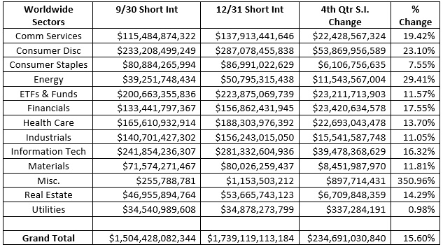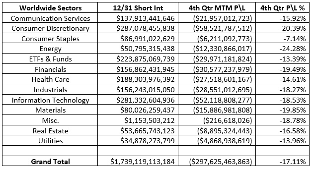 S3 Partners还补充道:“随着全球市场的持续攀升,我们可能会在2021年看到类似的短期活动:空头回补的趋势或将会因为损失的持续增加而维持下去,但随着做空股票价值的上升,整体空头头寸将不断增加。”做空者在第四季度承受了2980亿美元的损失,这使得许多做空者被迫离场。其中整体亏损最大的行业为非必需消费品和IT行业。总体而言,第四季度做空交易减少了17.11%。