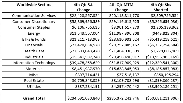 空头头寸方面,总体而言,第四季度全球空头头寸增长了15.60%,其中能源、非必需消费品和通信服务行业的增长幅度最大。另一方面,第四季度没有行业出现空头头寸的下降,而其中公用事业行业的增长幅度最小,空头头寸仅增长0.98%。