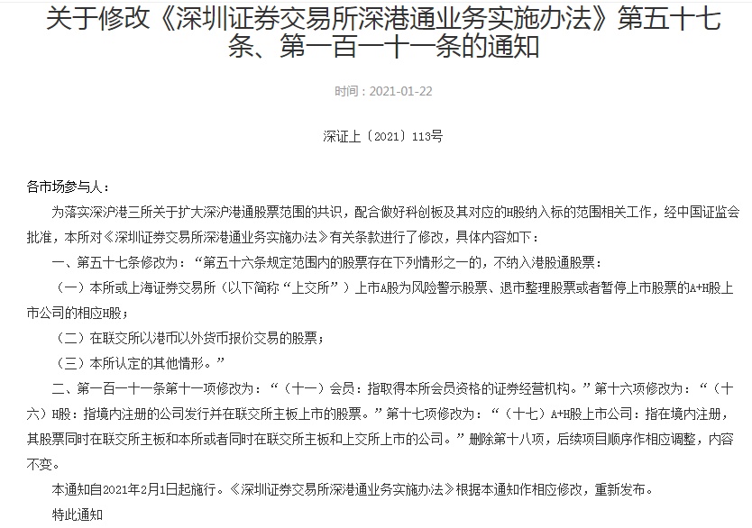 通知自2021年2月1日起施行。《深圳证券交易所深港通业务实施办法》根据本通知作相应修改,重新发布。