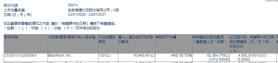 智通财经APP获悉,香港联交所最新资料显示,1月19日,贝莱德减持海螺水泥(00914)1694.0451万股,每股作价50.7596港元,总金额约为8.6亿港元。减持后最新持股数目约为6236.5万股,最新持股比例为4.8%。