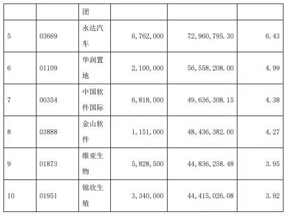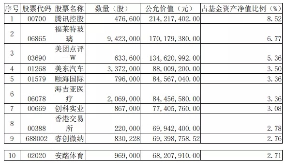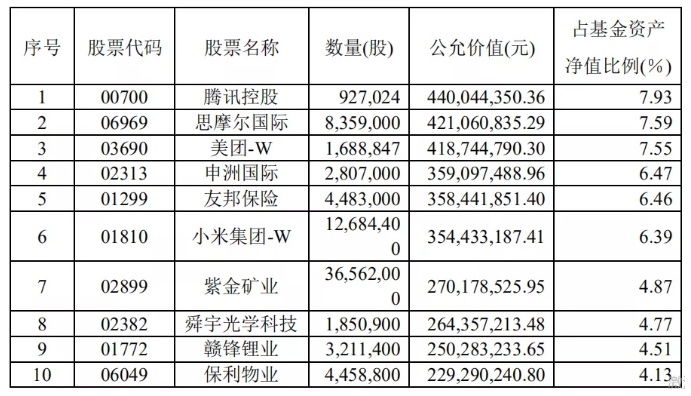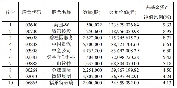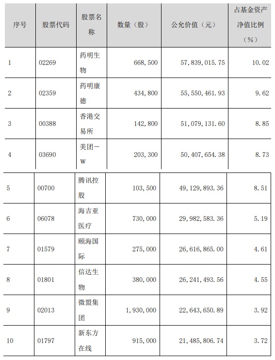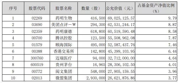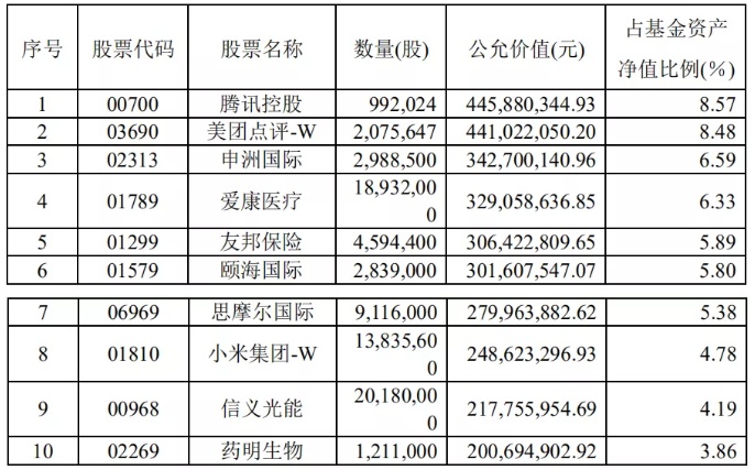 汇添富香港优势精选混合型证券投资基金四季报前十大重仓股为药明生物、颐海国际(01579)、阿里巴巴(09988)、美团、腾讯、药明康德、港交所、新东方、京东(09618)。