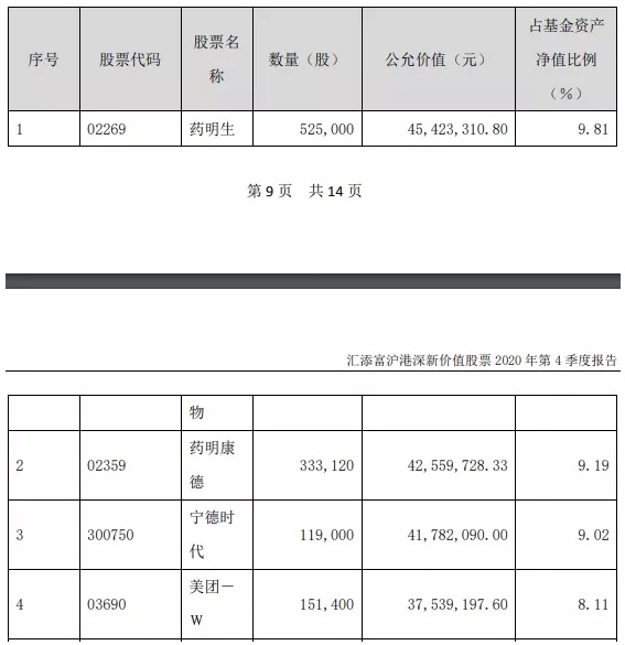 2020年1月21日、1月22日,部分基金公布了2020年4季度报告。