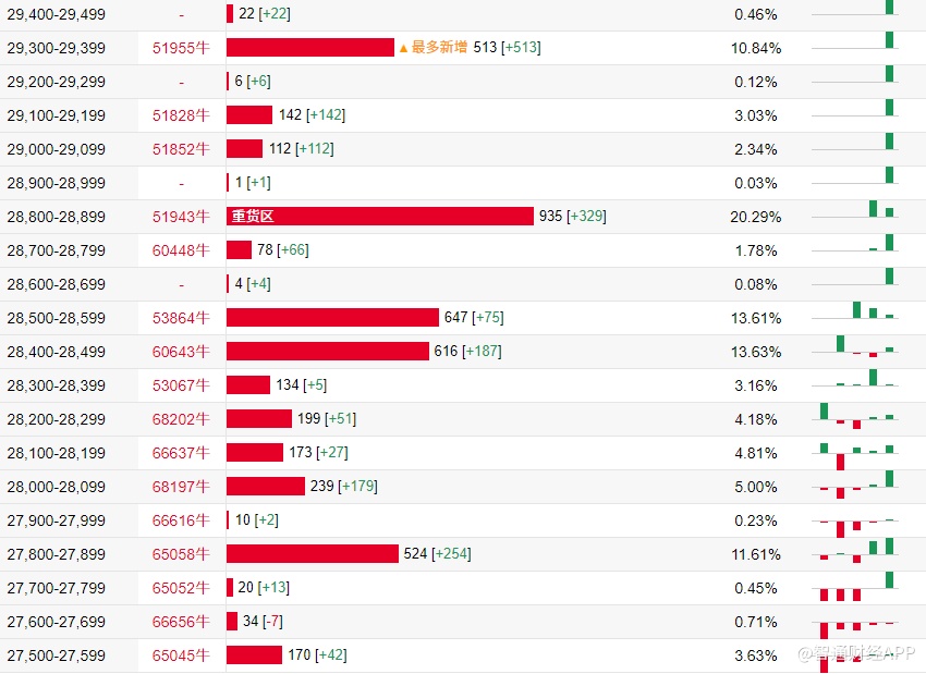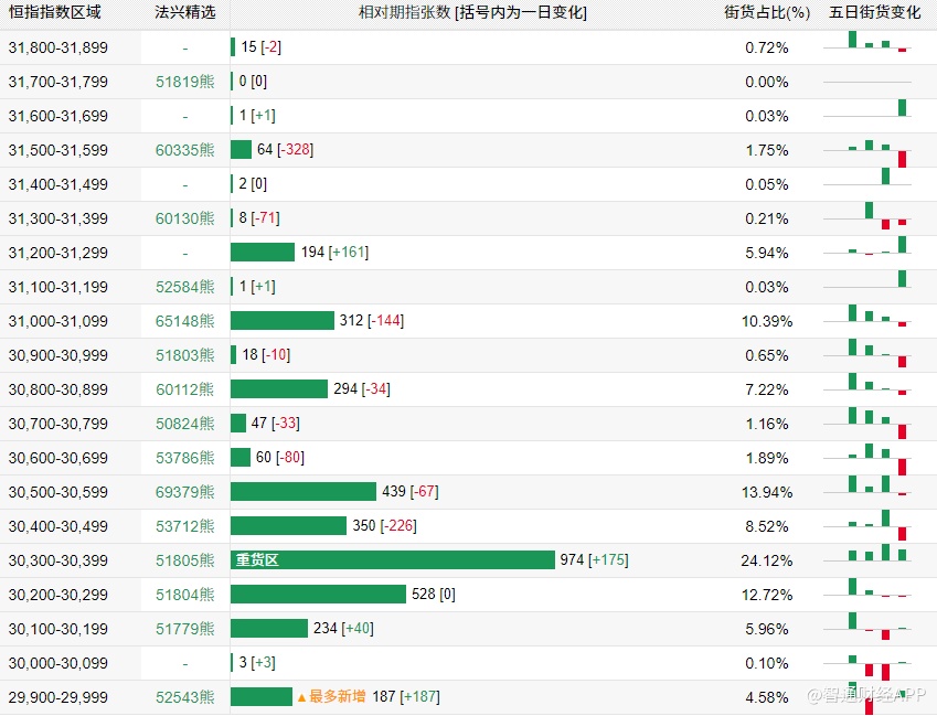 法兴恒指牛熊证街货分布图中的数据显示,熊证街货重货区在30300-30399区间,该区间最新熊证数量为974张,较上一交易日增加175张;最多新增在29900-29999区间,熊证数量为187张,增加187张。牛证街货重货区在28800-28899区间,该区间最新牛证数量为935张,较上一交易日增加329张。最多新增在29300-29399区间,牛证数量为513张,增加513张。