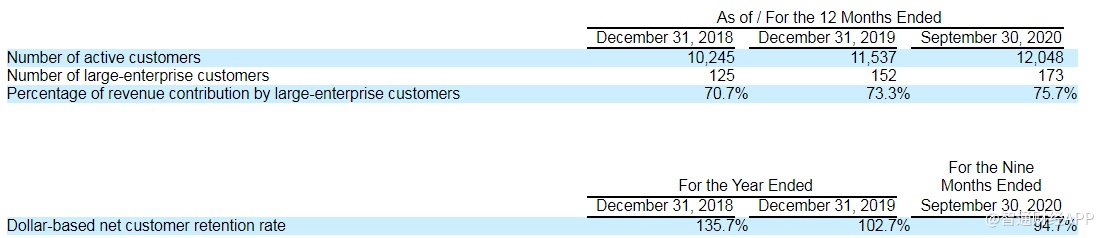 通过上述三大解决方案,容联覆盖了包括互联网、电信、金融服务、教育、工业制造和能源等不同行业的各类企业,活跃客户亦稳步增长。2018、2019、2020年前三季度,容联的活跃客户分别为1.02万、1.15万、1.2万,其中年消费金额10万美元以上的大客户分别为125家、152家和173家,且同期内定期解决方案基于美元的净客户保留率分别为131.2%、103.5%、98.2%。,维持高位水平。