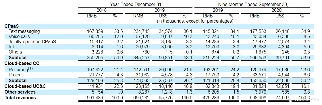 据招股书显示,2020年前三季度时,若以人民币计,CPaaS解决方案占公司总收入的比例为50.7%;CC解决方案、UC&C解决方案的收入占比则分别为28.4%、19.4%。