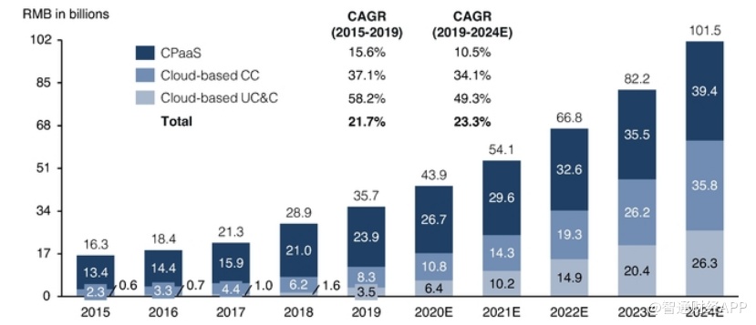 但由于目前基于云通信解决方案的市场渗透率仍处于较低水平,未来仍有较大的增长空间。CIC预计,从2019至2024年,基于云通信解决方案的市场规模将从357亿增至1015亿元,年复合增速23.3%。
