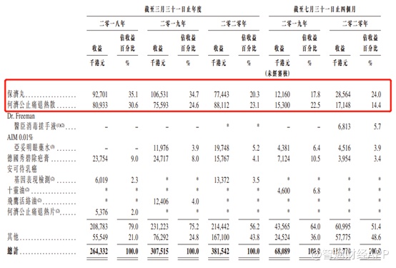 分产品来看,保济丸及何济公止痛退热散为公司两款最畅销的产品,2018至2020财年以及截至2020年7月31日,上述两款产品收入分别占公司总收入比例的65.7%、59.3%、43.4%以及38.4%,因此这两款产品的销售波动对公司的整体收益影响重大。特别是2020财年,受香港地区动荡以及公共卫生事件的影响,保济丸销售额减少2908.8万港元,使其销售占比从2019财年的34.7%直接下降至20.3%;为了保证保济丸的销售额,公司调整销售推广法,由定期促销活动改为提供全年促销活动,截至2020年7月31日,公司保济丸销售额为2856.4万港元,较2019年同期增加1640.4万港元。可见该举措确实迅速提升公司保济丸的销售额。