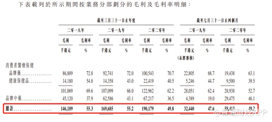 资料显示,健倍苗苗为医疗保健品推广及分销公司,旗下产品主要分为品牌药、健康保健品及品牌中药。品牌药活性成分为化合物,附有若干成分及特定剂型,用作即时医疗用途,名称、包装、容器统一。健康保健品包括针对消费者整体健康及保健的补充品、医疗耗材和其他非药物产品。品牌中药主要指中药、草药或者活性成分制成的药品、制剂等。截至2020年3月31日,健倍苗苗经营20个主要品牌,包括11个第三方品牌及9个自主品牌,合共占总收益的94.3%。