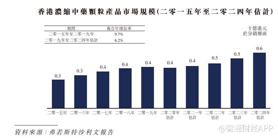 据招股书显示,健倍苗苗收购的Orizen主要产品为浓缩中药颗粒。而浓缩中药颗粒天花板低,压低了公司的想象力。根据弗若斯特沙利文报告来看,浓缩中药颗粒市场规模仅占香港药品市场的1.4%,2019年香港浓缩颗粒产品市场规模仅4亿港元,在某种程度上来说,这一市场天花板让公司的想象力大打折扣。