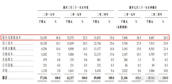 作为非处方药企业,品牌影响也十分重要,长期的广告投入可以巩固品牌,更好的营销。而公司在广告及推广投入方面也在缩水。招股书显示,随着公司营业收入的增长,公司广告投入不增反降。公司广告及推广成本从2018财年的3247万元下降至2020财年的3183.3万元,占比从56.8%下降至35.8%,2020年7月31日广告投入占比进一步下跌至26.5%。