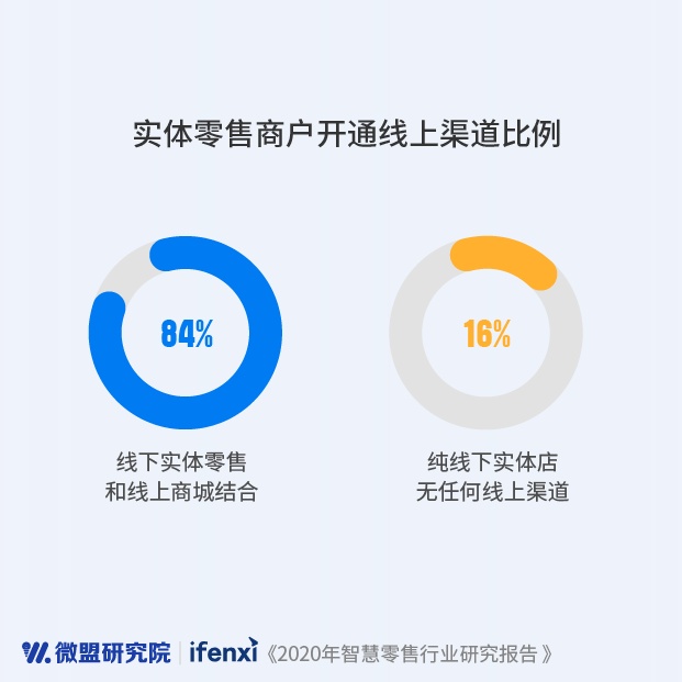 近年来,零售行业增速连年呈明显下滑态势,2011到2019年间,全国商品零售总额的增速从最高点17%降至8%,零售业亟需进行数字化改造,突破发展的瓶颈。2020年突发的卫生事件加速了这一进程,拥抱线上渠道、实现数字化转型成为零售企业想要在卫生事件寒冬中活下去的必选项。微盟报告的调查数据显示,实体零售开通线上渠道的企业占比高达84%,仅有16%的实体商家尚未开通任何形式的线上渠道。
