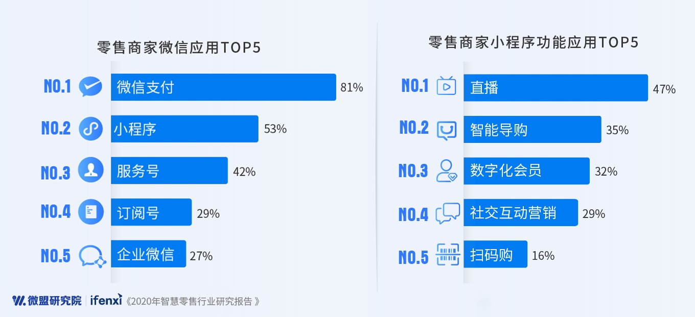 “2020年实体零售企业开通线上渠道的商户占比超过八成,私域流量建设成为商家运营智慧零售的重点,微信成为商家数字化经营的关键一环,小程序成为商家在微信支付之外应用最广的商业工具。”智慧商业服务提供商微盟近日发布《2020智慧零售行业研究报告》显示,在2020年卫生事件推动数字化狂奔的大背景下,卫生事件推动商家加速数字化转型,小程序、社群、企业微信等工具在赋能企业全时全域销售、提升销售力方面发挥积极作用。