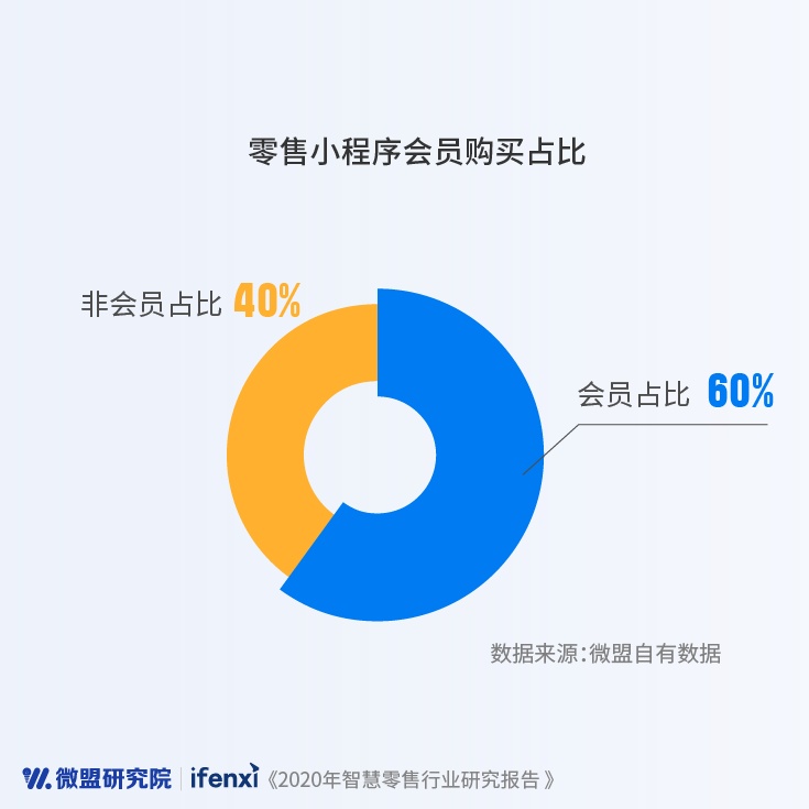 根据微盟报告对智慧零售商家应用现状的洞察,智慧零售主要从私域会员运营、门店引流、赋能导购等方面助力传统零售企业实现数字化升级助力,通过提升商家经营能力,为门店增加客流进而助力商家提升销量。其中,私域流量的建设成为商家运营重点,商家在应用智慧零售的过程中主要通过会员体系的建设沉淀私域流量。数据显示,零售小程序购物用户中,六成购买用户同时是商家会员,表明智慧零售在助力商家进行会员私域运营方面取得了一定成效,因此会员运营也成为许多商家在智慧零售实践中的重点。