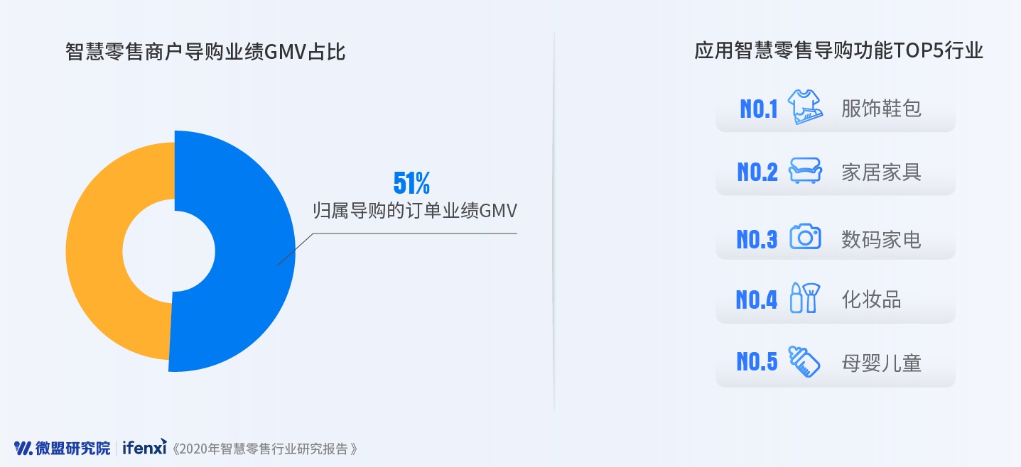 在门店中,导购作为连接商户和消费者的直接触点,是零售商户智慧升级的关键环节。微盟报告认为,智慧零售通过小程序、社群、企业微信等工具在赋能导购全时全域销售、提升销售力方面发挥积极作用。数据显示,使用智慧零售导购功能的商户中,归属导购的订单业绩占总GMV的比例超过五成,服饰、家居、数码家电、美妆、母婴等重导购的行业对导购数字化需求度较高。