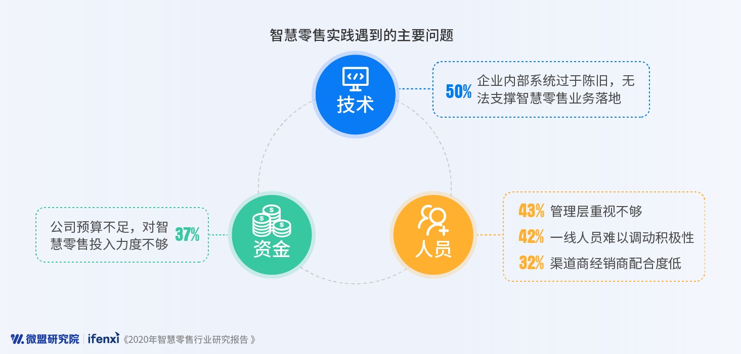 企业智慧零售实践中,技术、人员、资金三大问题成为智慧零售顺利实施的最大阻碍。调查数据显示,约一半的商家在实践智慧零售的过程中,由于企业各方面技术不完善,原有的内部系统过于陈旧不能支撑智慧零售业务的发展。同时,企业管理层对智慧零售不够重视、缺乏专业人才以及一线人员的智慧零售意识薄弱、实体代理商不够配合等人员因素也成为企业实践智慧零售的突出问题,使得智慧零售模式难以真正落地。第三方服务商的出现,帮助零售企业有效破除技术和人员壁垒,在企业智慧零售实践中发挥关键作用。