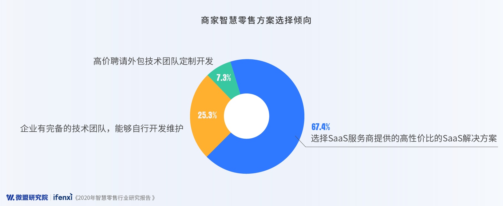 从企业对智慧零售的投入预算来看,根据微盟研究院问卷调查,仅35%的商户每年对智慧零售的预算投入在20万元以上,47%商家投入预算在10万元以下,这表明商家目前对智慧零售的投入普遍不高。因此在智慧零售方案的选择上,超过六成的受访商户更加倾向选择SaaS服务商提供的高性价比的SaaS解决方案;拥有专业技术团队、能自行开发维护智慧零售方案的企业占25.3%,选择技术外包进行定制化开发的企业仅占7.3%。