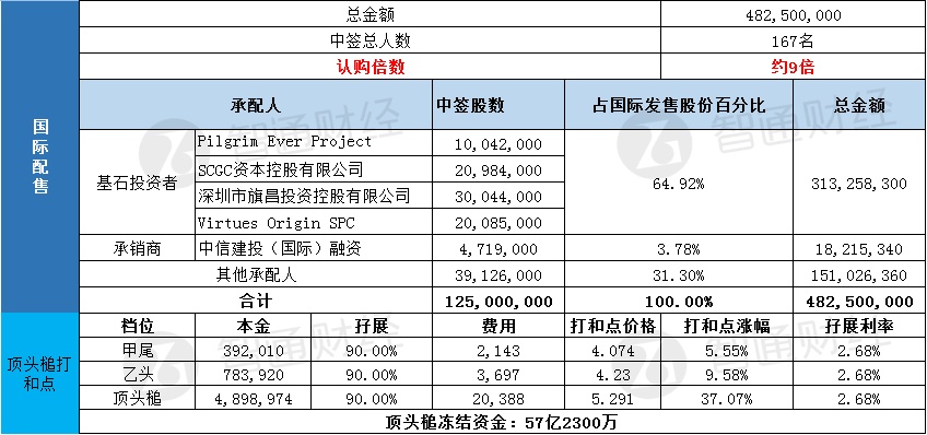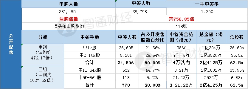 其中,公开配售申购人数331495人,一手中签率1.29%,认购倍数约756.85倍。