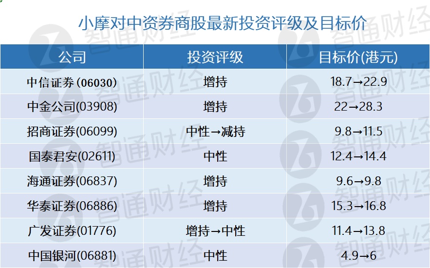 该行上调中资券商股目标价,并维持中金公司(03908)为行业首选,相信其为行业增长的主要受惠者之一,但将招商证券(06099)由“中性”降至“减持”,且将广发证券(01776)由“增持”降至“中性”。