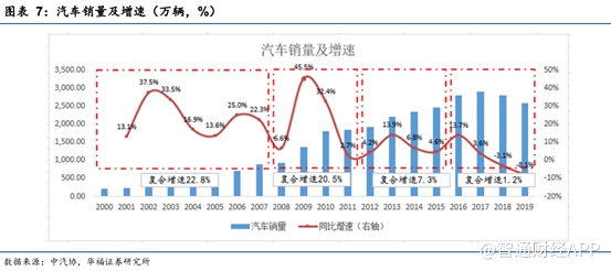 2007年以前我国汽车产业处于高速成长期,2008年以后经历三轮周期,2008-2011年销量复合增速仍较快(20.5%),2012-2015年增速放缓为7.3%,2016-2019年复合增速仅1.2%,2018年我国汽车销量历史上首次负增长。可以看到,我国汽车行业需求增长中枢显著下滑,汽车产业已由增量时代切换到存量竞争的后增长时代。