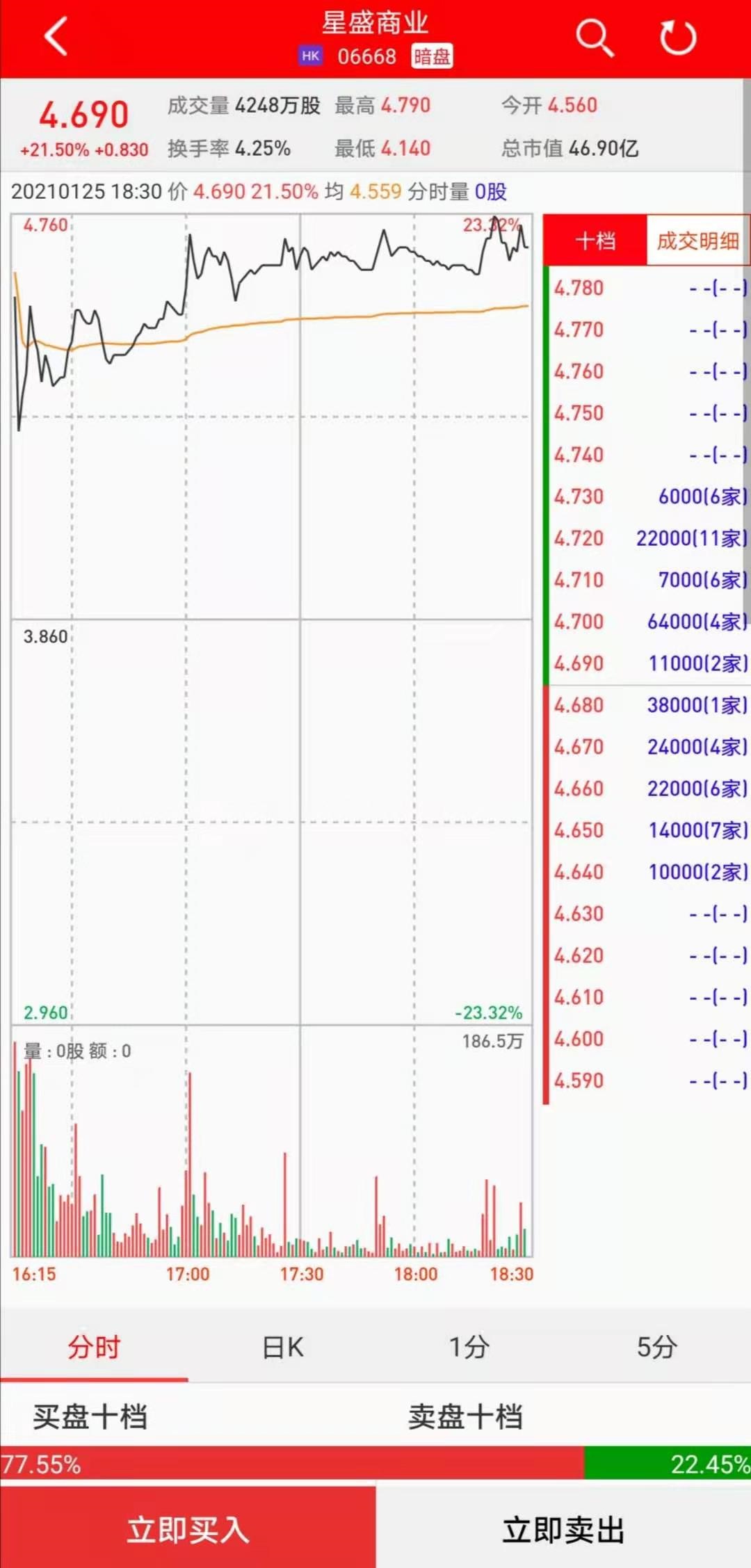 智通财经APP获悉,星盛商业(06668)将于1月26日(星期二)在香港挂牌,截至暗盘收盘,利弗莫尔证券资料显示其暗盘报价4.69港元,较招股价3.86港元涨21.5%。每手1000股,不计手续费,每手赚830港元。