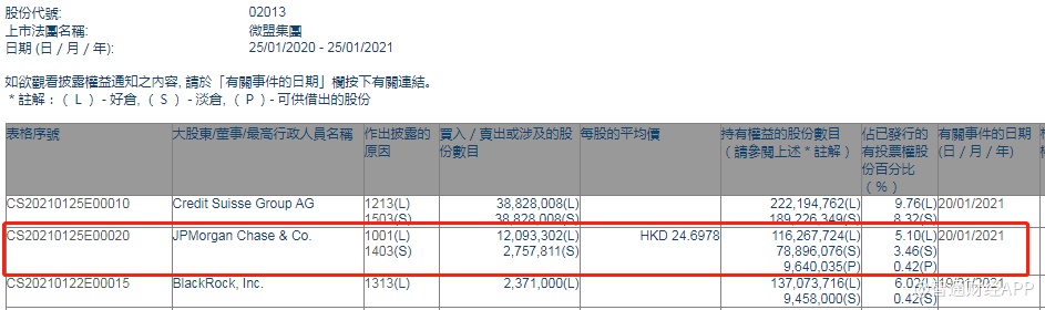 智通财经APP获悉,香港联交所最新资料显示,1月20日,摩根大通增持微盟集团(02013)1209.33万股,每股作价24.6978港元,总金额约为2.99亿港元。增持后最新持股数目约为1.16亿股,最新持股比例为5.10%。