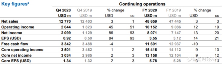 2020年全年净销售额486.59亿美元,同比增长3%;净利润80.71亿美元,同比增长13%;每股收益3.55美元,去年同期为3.12美元。