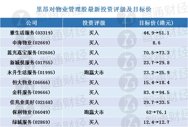 智通财经APP获悉,里昂发布研究报告称,普遍上调物管股目标价,将雅生活服务(03319)目标价由44.9港元升至51.1港元,维持“买入”评级,升蓝光嘉宝服务(02606)目标价由70.5港元升至73.3港元,评级“买入”,将新城悦服务(01755)目标价由23.7港元升至29.8港元,评级“买入”。