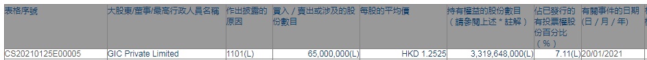 智通财经APP获悉,香港联交所最新资料显示,1月20日,新加坡政府投资有限公司增持中国铁塔(00788)6500万股,每股作价1.2525港元,总金额为8141.25万港元。增持后最新持股数目约为33.20亿股,最新持股比例为7.11%。