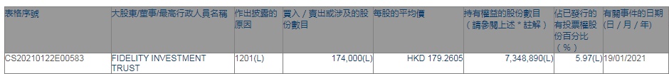 智通财经APP获悉,香港联交所最新资料显示,1月19日,FIDELITY INVESTMENT TRUST减持泰格医药(03347)17.4万股,每股作价179.2605港元,总金额约为3119.13万港元。减持后最新持股数目约为734.89万股,最新持股比例为5.97%。