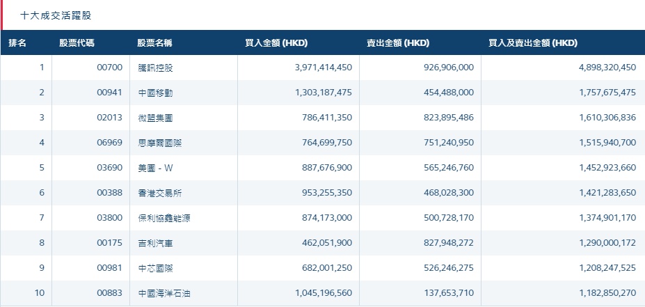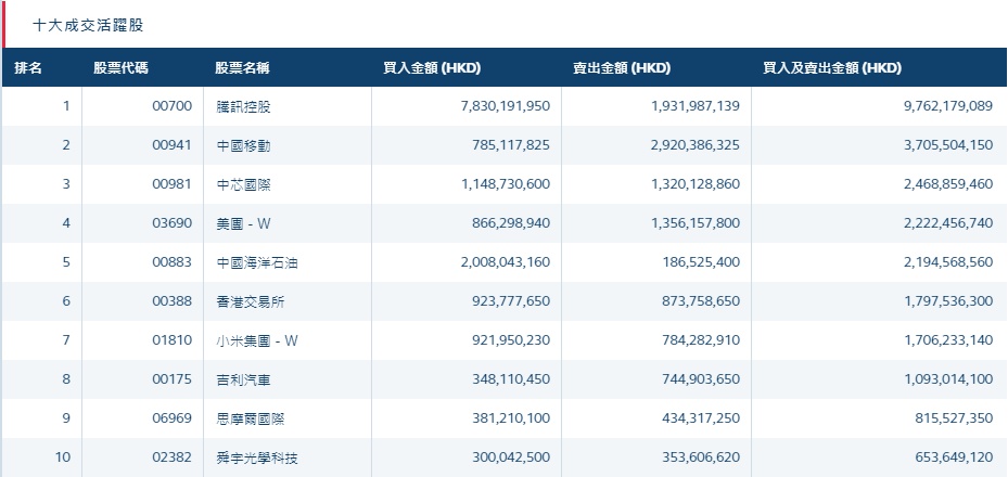 腾讯(00700)获净买入89.42亿港元。消息面上,近日多家大行发布研报唱好腾讯,均予800港元以上目标价。据悉,花旗维持腾讯“买入”投资评级,称其为该行的首选及核心持有股份,目标价升19%,由原来的734港元上调至876港元;麦格理重申对腾讯"跑赢大市"评级及目标价846港元;瑞银上调腾讯目标价18.6%,自700港元上调至830港元;里昂上调腾讯目标价14.7%至820港元,重申“买入”评级。