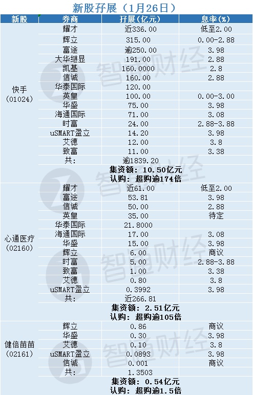 智通财经APP获悉,快手(01024)、心通医疗(02160)、健倍苗苗(02161)正在招股中。截至1月26日,辉立、信诚等合计分别为其借出逾1839.20亿港元、近266.81亿港元、1.3503亿港元,其中快手超购逾174倍、心通医疗超购逾105倍、健倍苗苗超购逾1.5倍。