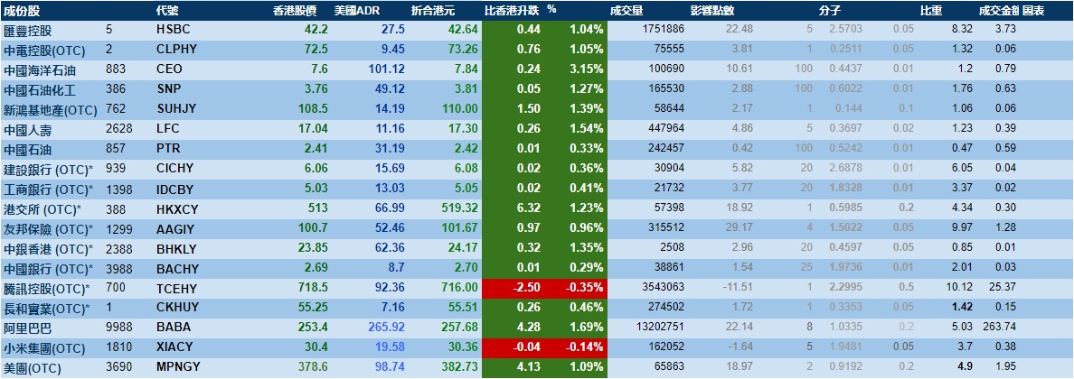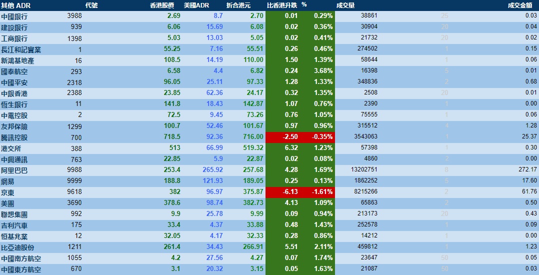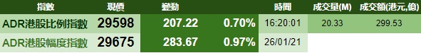 智通财经APP获悉,周二美股三大指数微跌,港股ADR指数上涨,按比例计算,收报29598点,涨207.22点或0.7%。