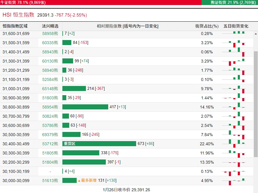 智通财经APP获悉,截至1月27日,恒指最新的牛熊街货比例为78:22。