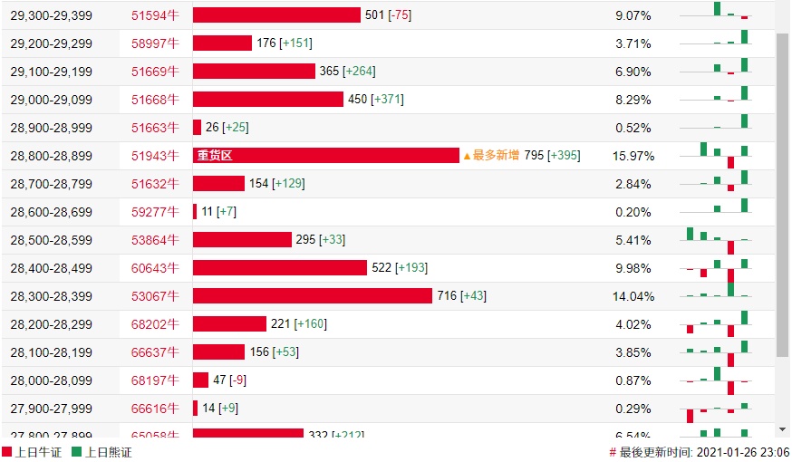 法兴恒指牛熊证街货分布图中的数据显示,熊证街货重货区在30400-30499区间,该区间最新熊证数量为673张,较上一交易日增加86张;最多新增在30000-30099区间,熊证数量为131张,增加130张。牛证街货重货区在28800-28899区间,该区间最新牛证数量为795张,较上一交易日增加395张;最多新增也在该区间。