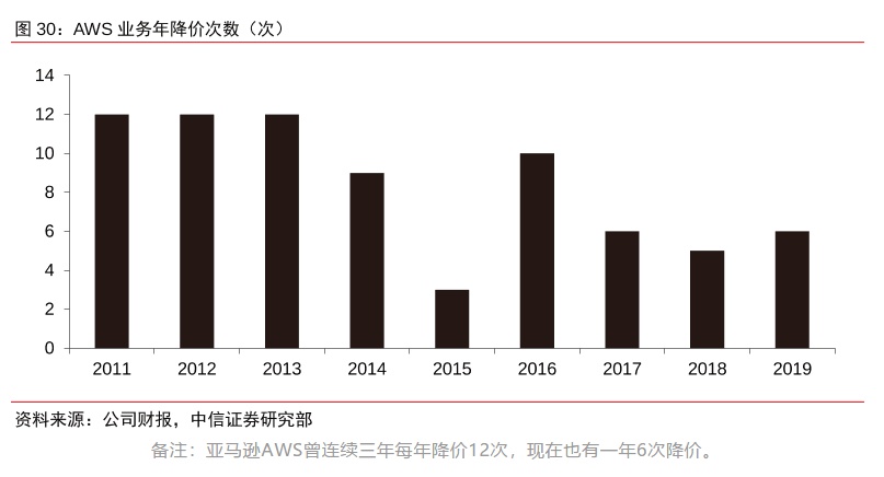 备注:亚马逊AWS曾连续三年每年降价12次,现在也有一年6次降价。