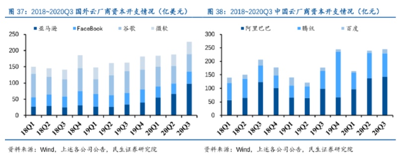 亚马逊 2020Q3 购置固定资产支出 110.63 亿美元,环增 48.32%;阿里云未来3年将再投2000亿元人民币;腾讯云方预计未来5年投入5000亿元人民币,用于新基建。