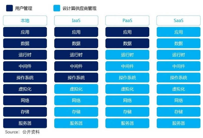 简单讲,云计算是一种To B综合性服务的统称,目前常见的有IaaS(基础设施即服务)、PaaS(平台即服务)、SaaS(软件即服务)三种服务类型。