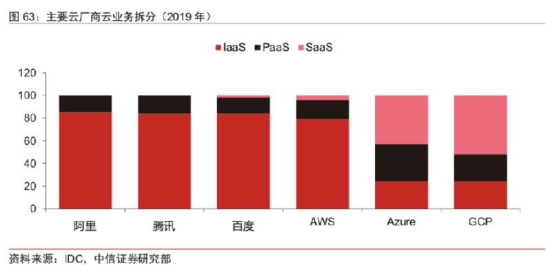 目前,国内云厂商以及亚马逊的AWS主要以IaaS业务为主,其他主要云厂商如微软(MSFT.US)的Azure、谷歌(GOOG.US)的GCP业务类型均衡发展。