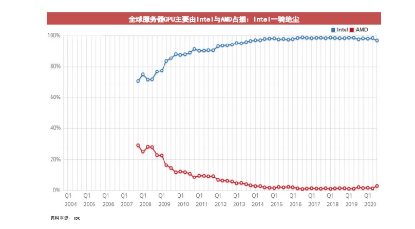 产业链上溯,行业集中度进一步收窄。服务器三大构成元件之一的CPU(占比总成本的50%左右),90%以上的市场份额由英特尔供应。