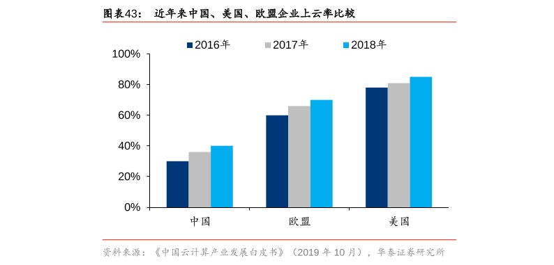 目前云计算在国内仍然是一个比较新鲜的产品,有着巨大的市场空间和发展情景。数据显示,2018年国内企业的“上云率”仅为40%,远低于美国企业85%和欧盟企业70%。