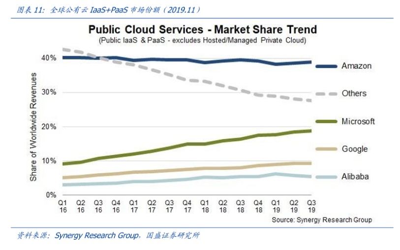 与此相对的是,资源向大厂商的集中。截至2019Q3,全球IAAS市场份额,80%以上都集中在四大头部公有云服务商。