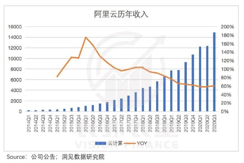 阿里云也是近几年云服务领域的降价”活跃分子”,曾有过一年多时间降价17次的疯狂举动。但其收入一直保持着高速增长,如下表所示,2015Q1~2020Q3增速始终维持在60%以上。