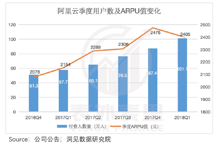 但从财报数据来看,2016Q4~2018Q1,阿里云的付费用户数,以及季度ARPU值是同步上涨的。
